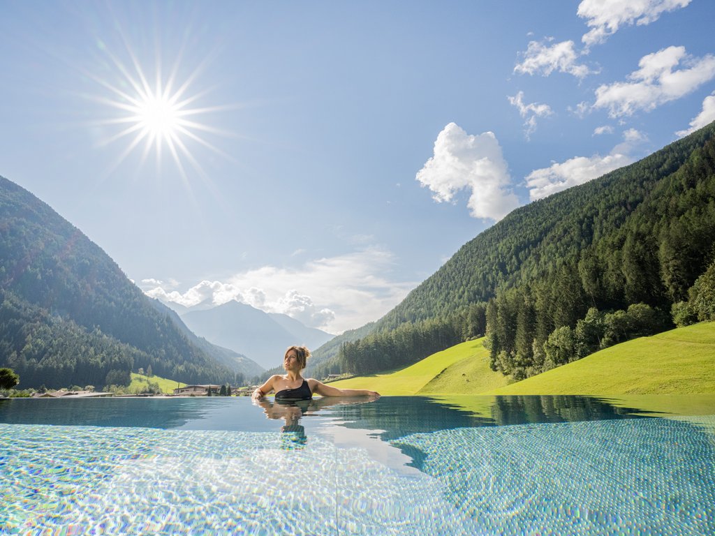 Ja. Im Adults-Only Sky Spa befindet sich ein 23 Meter langer Infinity Pool auf dem Dach mit Blick auf die Bergwelt des Ahrntals.
