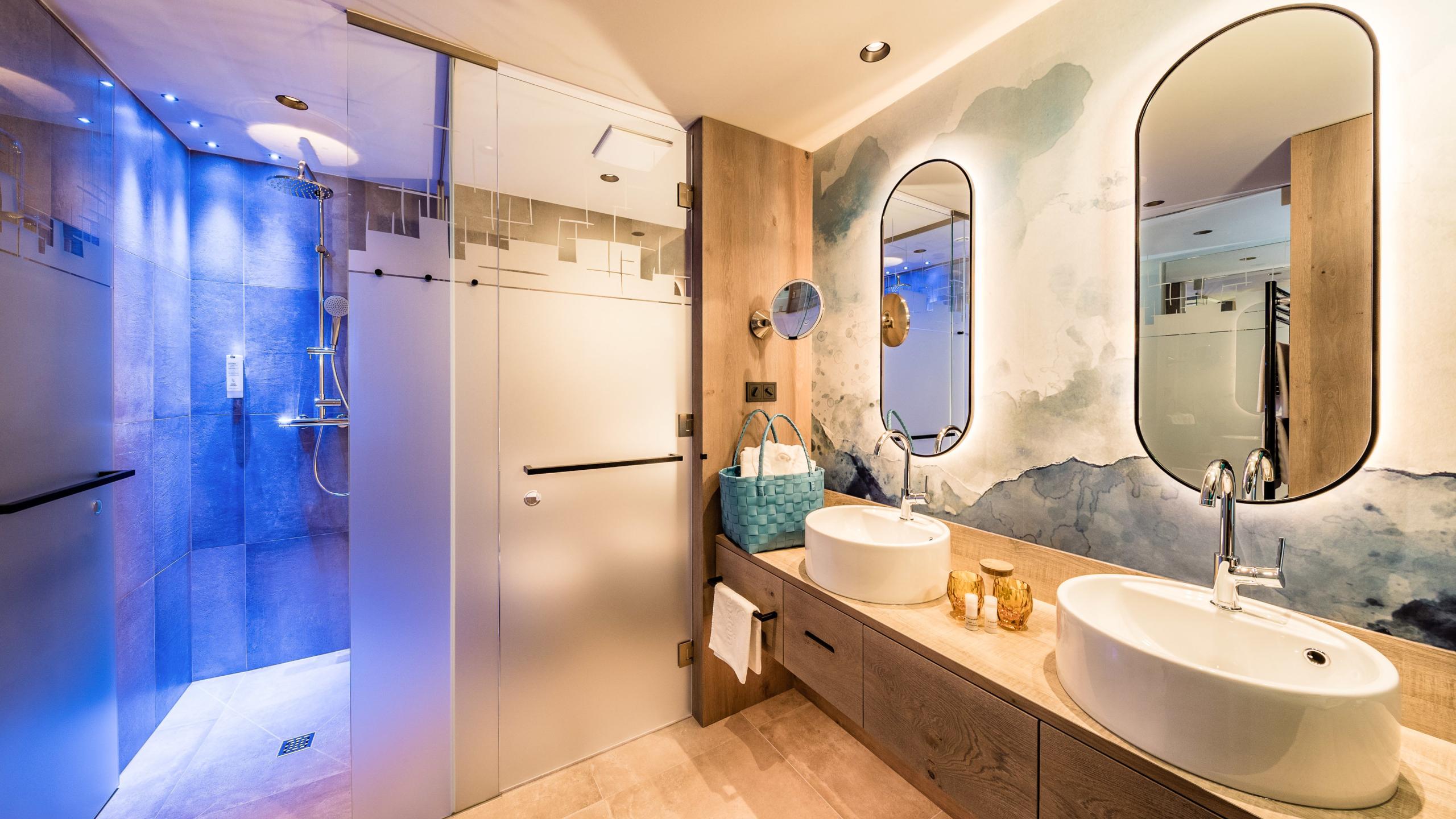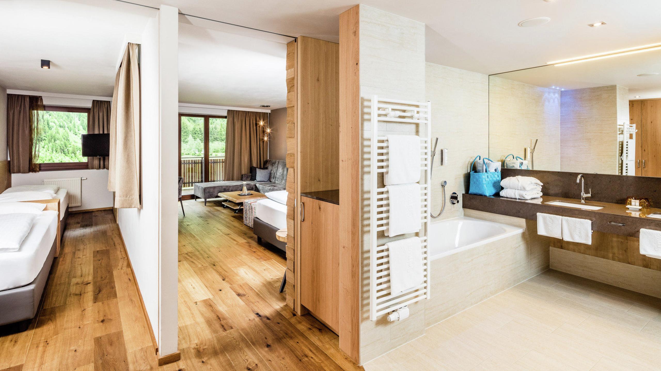 Spacious living room and bedroom in one with separated kids room with three beds (min. 4 pax), approx. 55 m², wooden floor, all with balcony, bathroom with shower (or shower and bath tub), separate toilet and bidet, double wash basin, makeup mirror, hair dryer, wellness bag with bath towel and bathrobe, small fridge, radio, safe, corner couch, Flat-TV, telephone, free wireless lan, reserved underground parking slot.