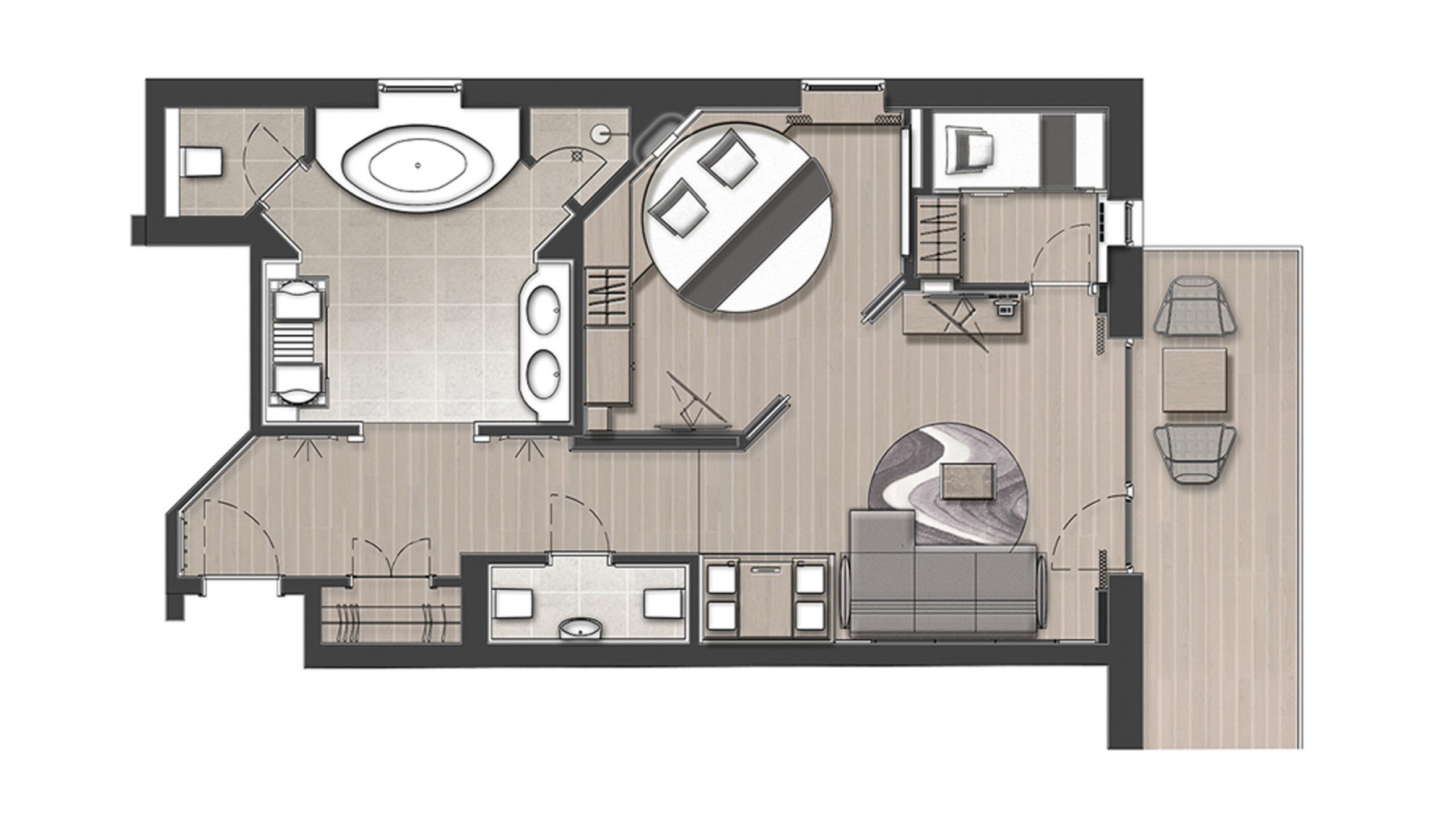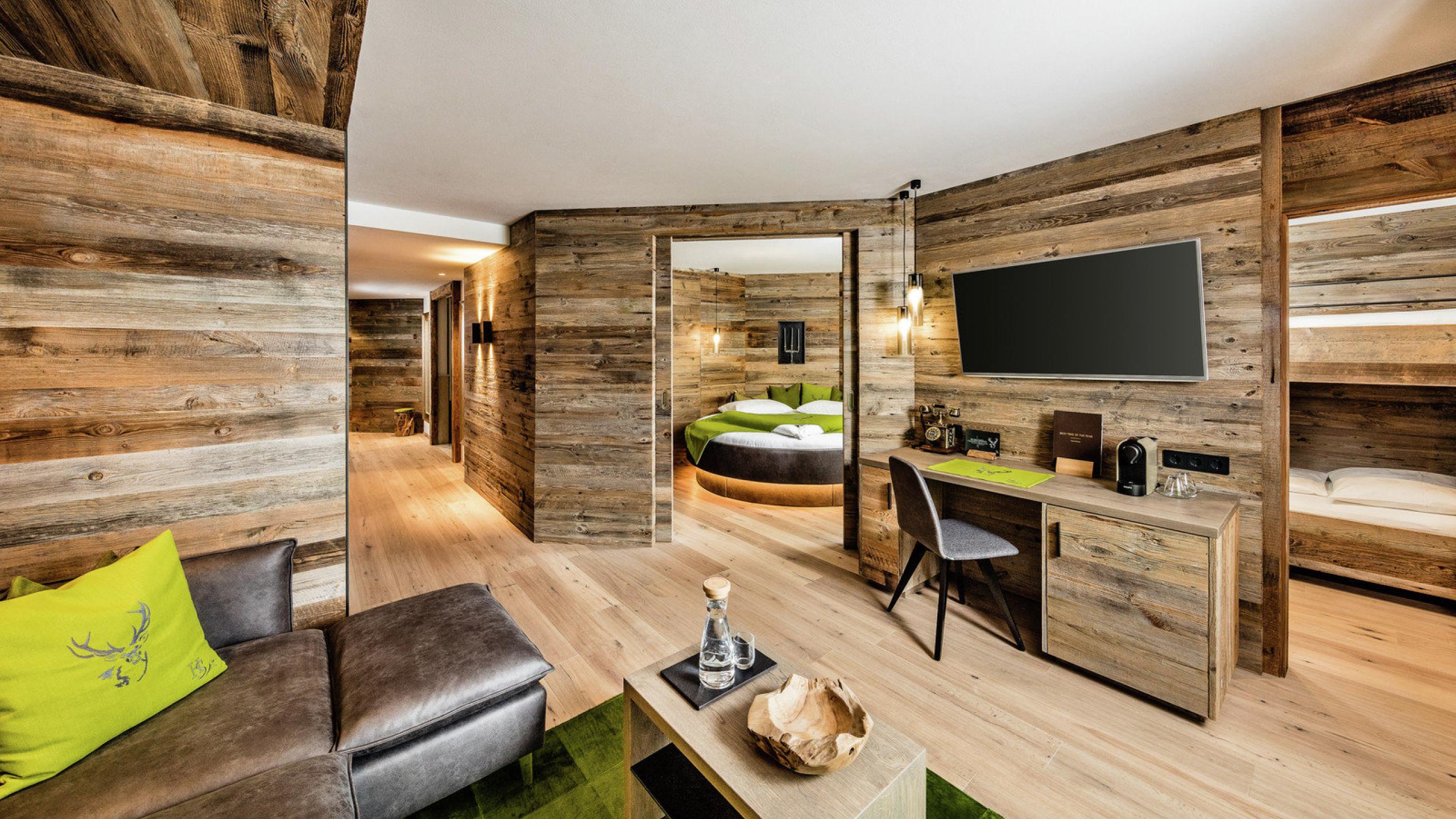 Suite lussuosa nello stile chalet, ca. 70 m², pavimento in legno, con zona notte e zona giorno separate e stanza separata per bambini con letti a castello, letto matrimoniale rotondo, private biosauna (calore infrarosso con vapore acqueo), stube sudtirolese originale, angolo divano accogliente, macchina per caffè Nespresso, ampio bagno in marmo con doccia separata e grande vasca, doppi lavandini, bidet, 2 wc separati, asciugacapelli, borsa da bagno con asciugamano e accappatoio, frigorifero, radio, cassaforte, scrivania, Flat-TV, telefono, ascensore, parcheggio sotterraneo riservato, balcone verso sud e W-Lan gratuito.