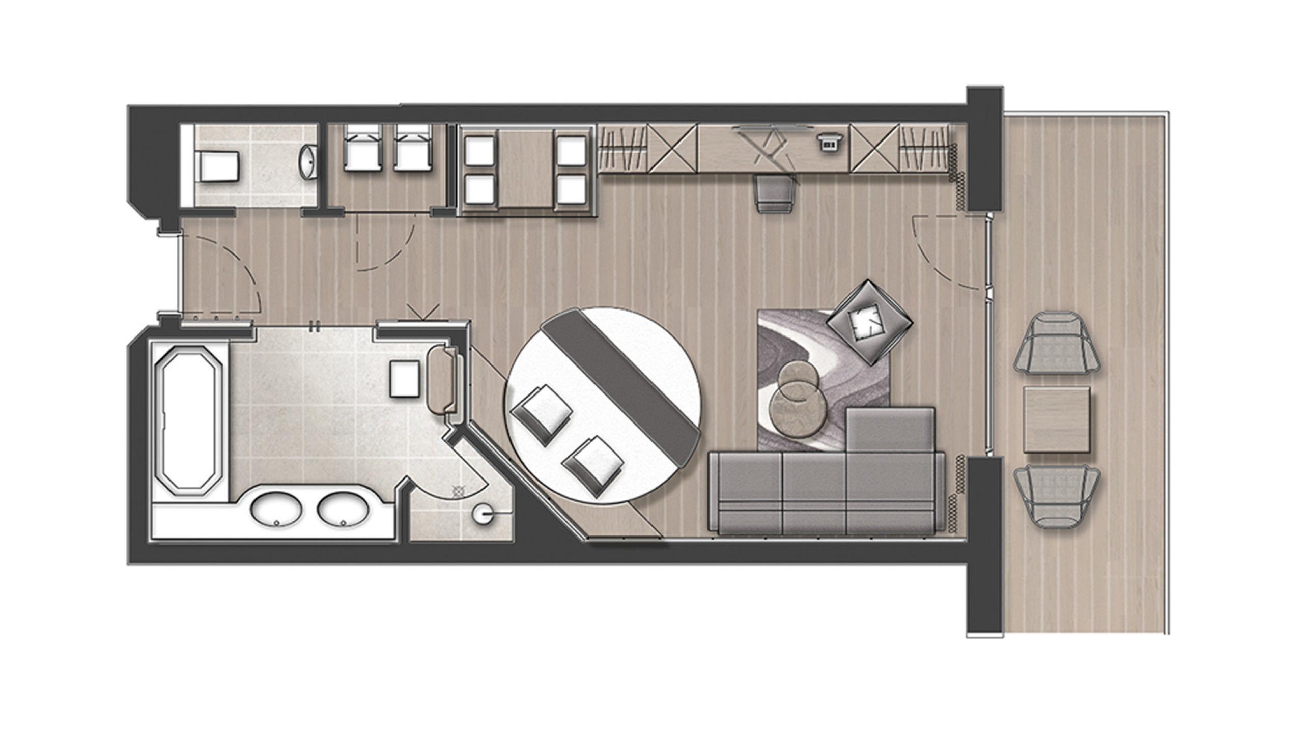 Camera da letto lussuosa con zona giorno di ca. 50 m², pavimento in legno, letto matrimoniale rotondo, cabina infrarossi (calore profondo), stube sudtirolese originale, angolo divano accogliente, macchina per caffè Nespresso, ampio bagno in marmo con doccia separata e vasca, doppi lavandini, WC separato con funzione bidet, specchio per truccarsi, asciugacapelli, borsa da bagno con asciugamano e accappatoio, frigorifero, radio, cassaforte, scrivania, Flat-TV, telefono, ascensore, parcheggio sotterraneo riservato, balcone verso sud e W-Lan gratuito.