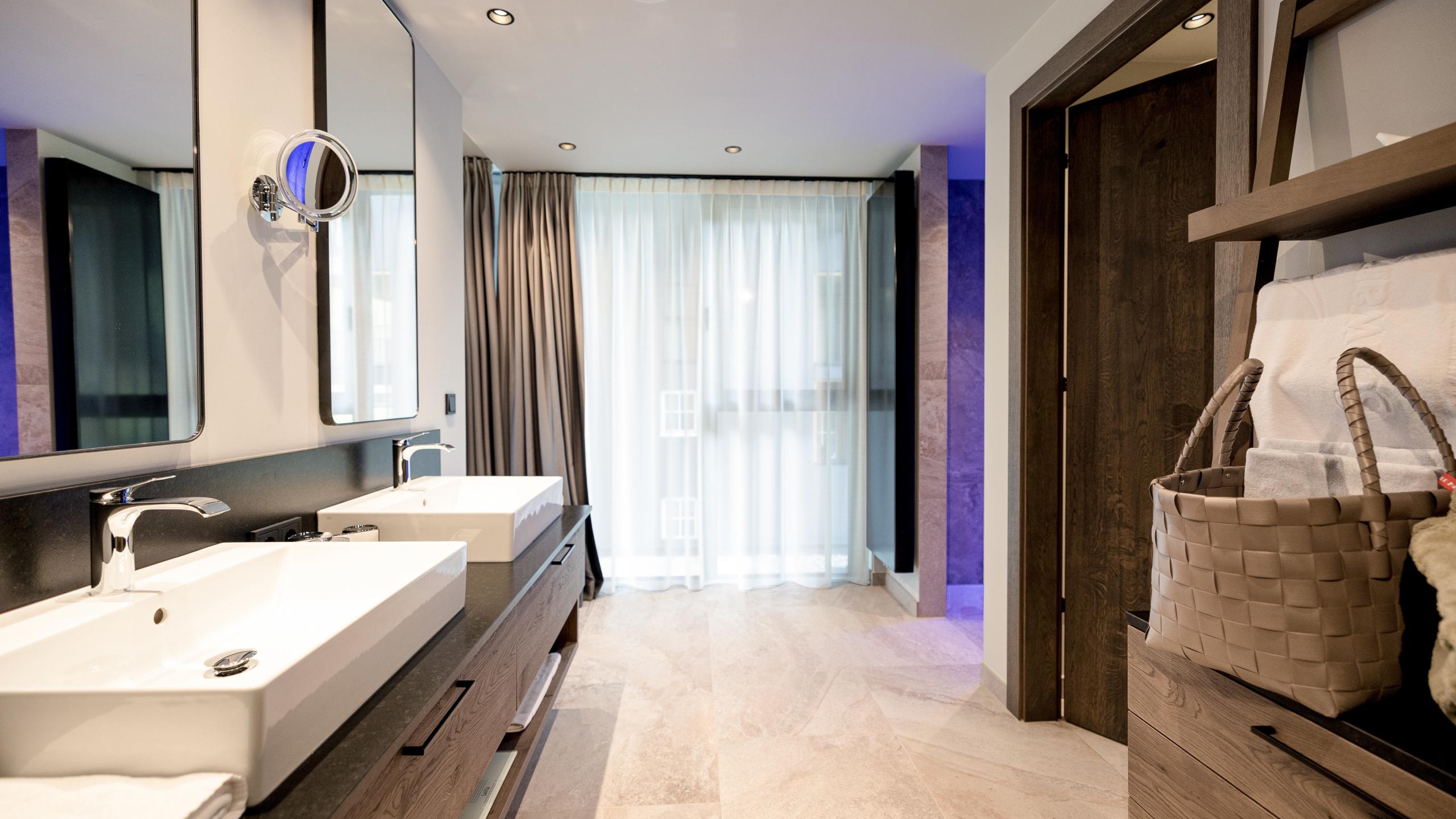 Suite lussuosa di ca. 100 m², con pavimento in legno, zona notte e zona giorno separate e stanza doppia per bambini con bagno privato, vasca idromassaggio riscaldata (36 °C, dalle ore 8 alle ore 22) sul balcone, sauna finlandese, angolo divano accogliente, fuoco artistico romantico, macchina per caffè Nespresso, scelta di tè assortiti, ampio bagno con doccia, doppi lavandini, wc e bidet, asciugacapelli, borsa da bagno con asciugamano e soffice accappatoio, frigo, radio, cassaforte, scrivania, Flat-TV, telefono, parcheggio sotterraneo riservato, balcone verso sud e W-Lan gratuito.