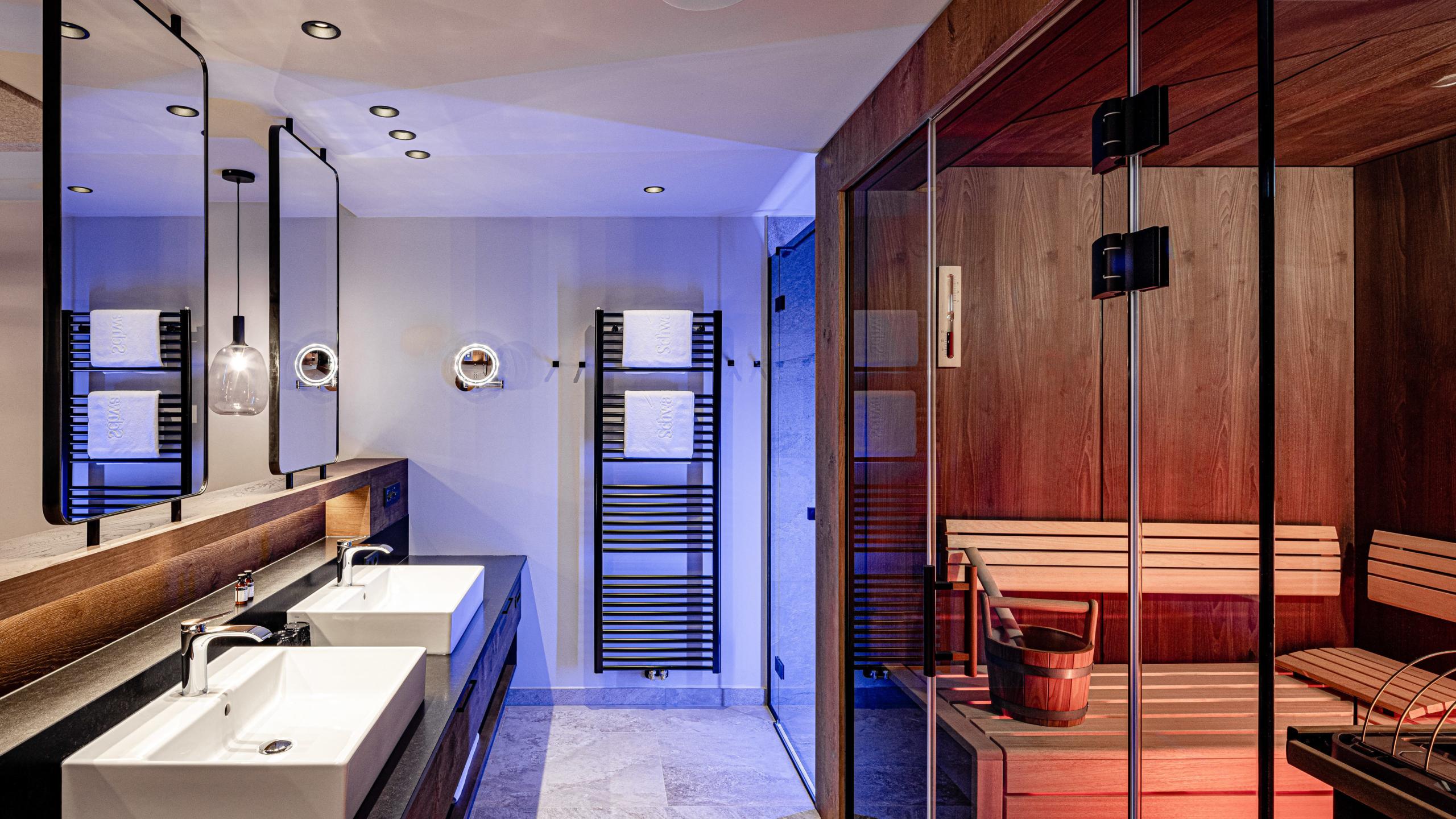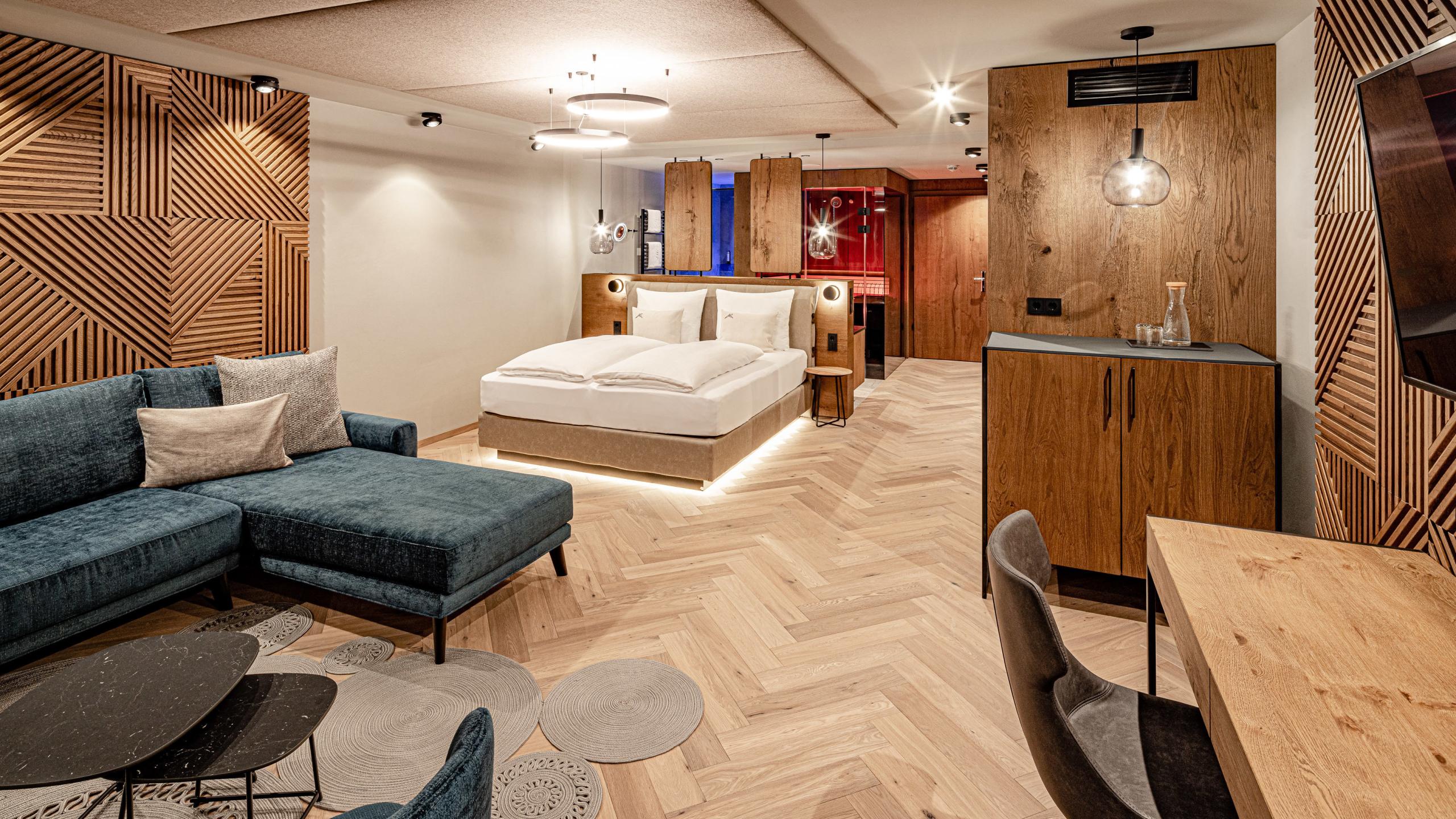 Camera da letto lussuosa con zona giorno di ca. 50 m², pavimento in legno, sauna finlandese, vasca idromassaggio riscaldata (36 °C, dalle ore 8 alle ore 22) sul balcone, angolo divano accogliente, macchina per caffè Nespresso, scelta di tè assortiti, ampio bagno con doccia, doppi lavandini, wc e bidet, asciugacapelli, borsa da bagno con asciugamano e soffice accappatoio, frigo, radio, cassaforte, scrivania, Flat-TV, telefono, parcheggio sotterraneo riservato, balcone verso sud e W-Lan gratuito.